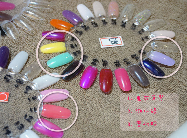 今天一共挑了三個顏色,除了我自己很喜歡的蜜桃粉資外,還搭配很適合夏天的薰衣草紫和湖水路....